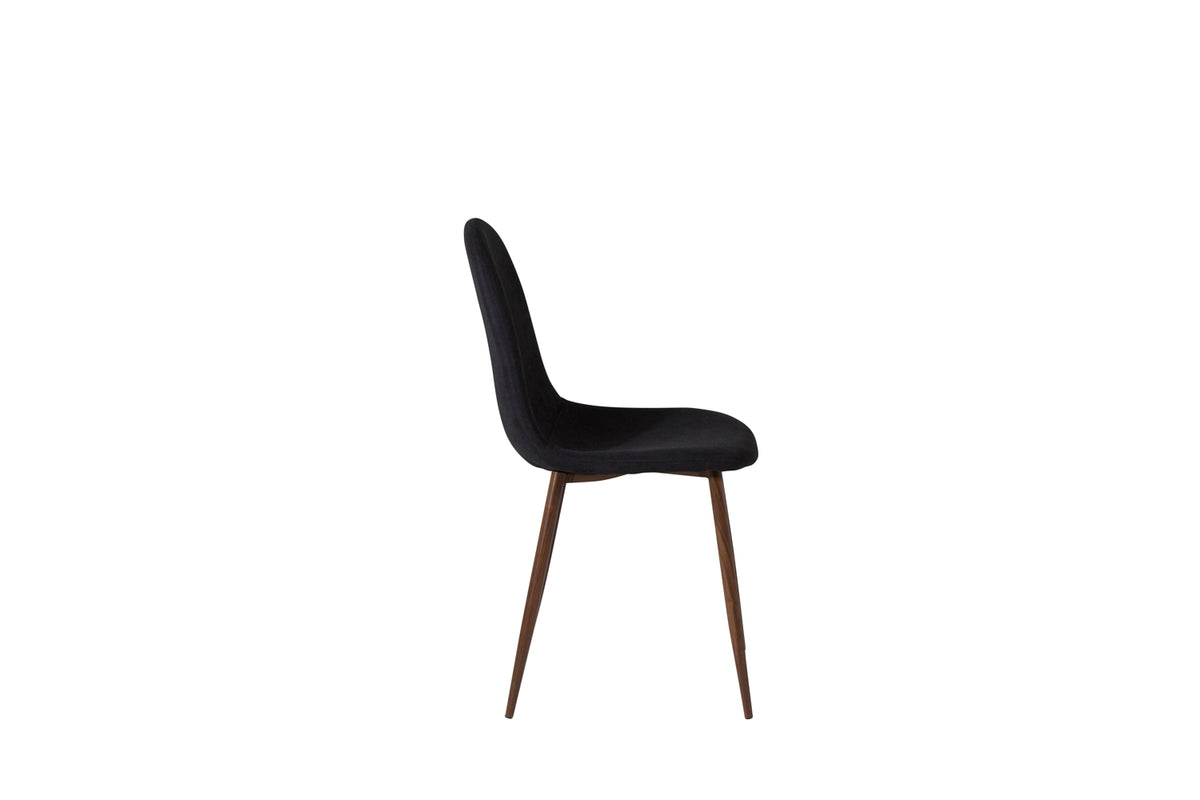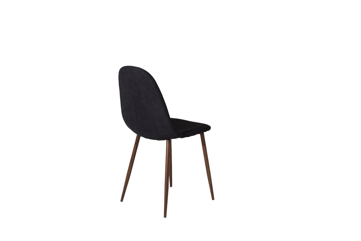 Polar matstol med ben i valnötsfollierad metall toppar trendlistorna med sin iögonfallande design! Lätt rundad, klassisk rygg med plan sits i svart polyestertyg med stoppning. Lättare montering krävs. Här sitter du bekvämt tillsammans med familj och vänner i flera timmar! Skötselråd: Använd textilspray för att impregnera textilen innan du börjar använda den, det kommer även göra att eventuell smuts och fläckar blir lättare att ta bort framöver. Ta bort fläckar med en gång, gnid inte utan försökt suga upp varsamt med en trasa.