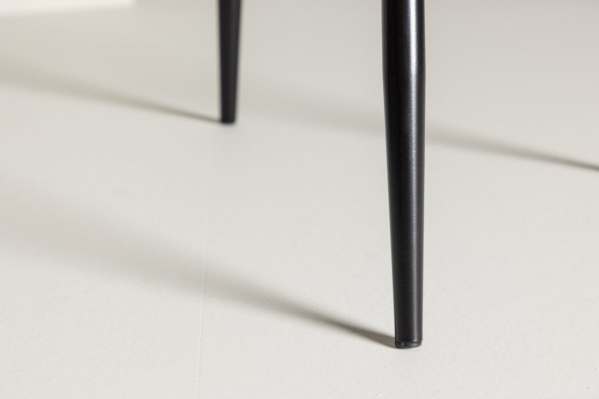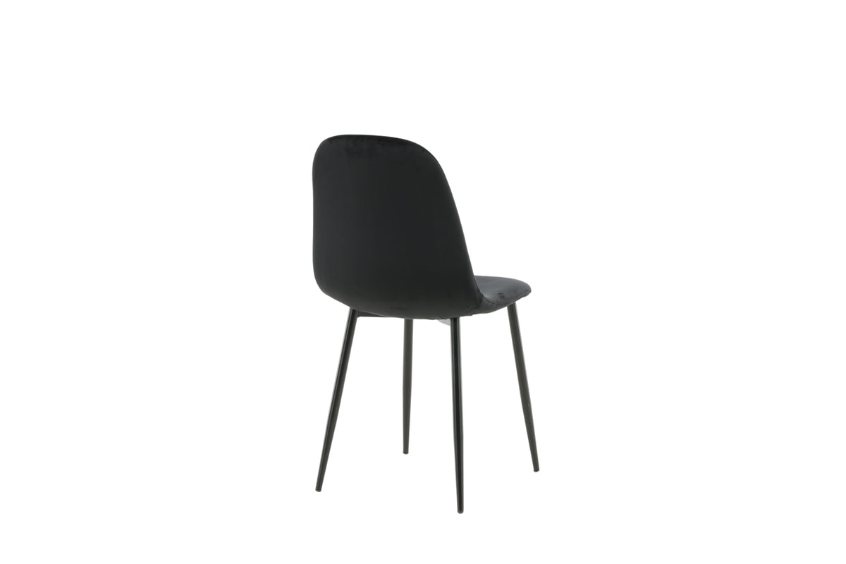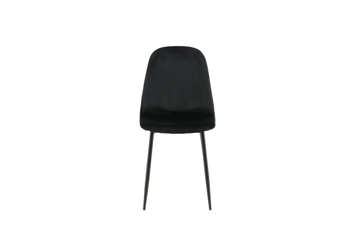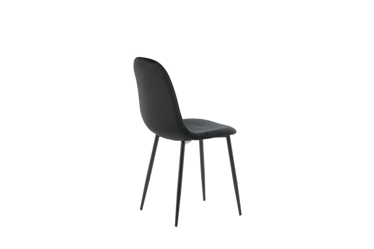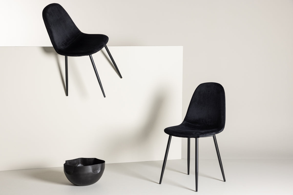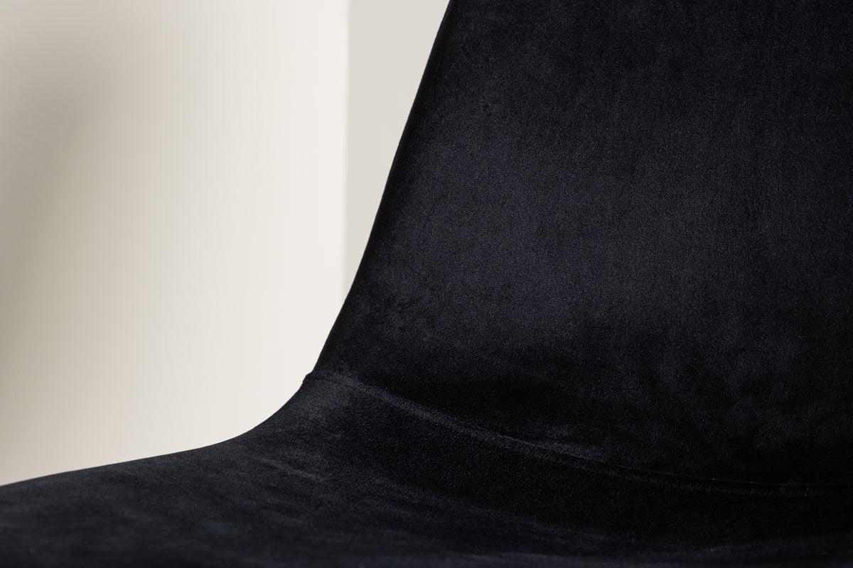 Stilren matstol i genomgående svart kulör med modern utformning - vad mer kan man önska? Polar har en helklädd design, ben i svart pulverlackerad metall samt rundad rygg och sits i svart sammetstyg med mjuk stoppning. Slipp kompromissa mellan komfort och design! Lättare montering krävs. Skötselråd: Sammet har en tendens till att få tryckmärken när luggen lägger sig ner. Avtrycken kan göra att tyget ser slitet ut, vilket här helt normalt för den här typen av material. Beroende på hur ljuset faller kan tyget skifta i flertalet olika nyanser.