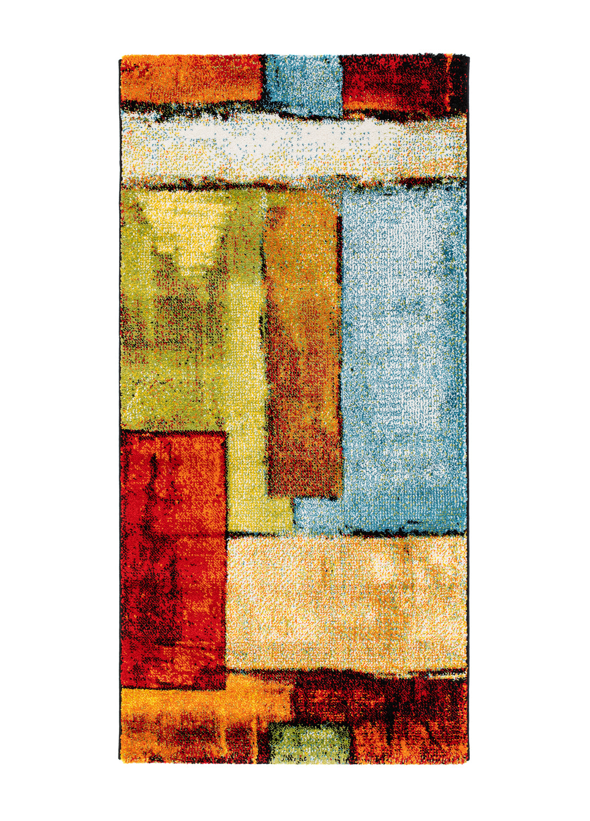 Brilliance Multi är en maskinvävd matta med ett fint mönster av rutor i olika storlekar och färger. Mattan går blå, grön, rost, gul, röd och vit med svart ytterkant runt varje ruta.