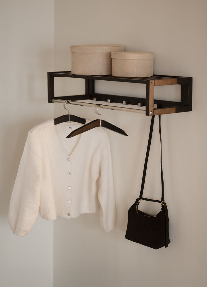 Confetti hatthylla massiv och brunlackad ek. Hatthyllan är både praktisk och modern med snygga krokar i metall. Hatthyllan ingår i hallserien Confetti.