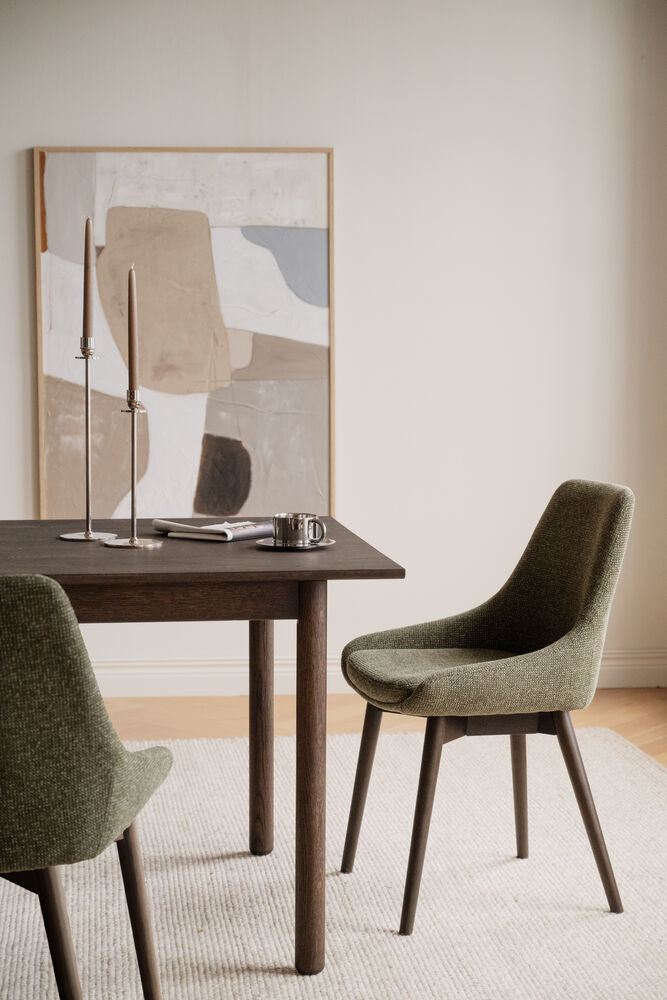 Denley är en tidlös stol i grön textil med stolsben i brun ek som förenar mjuk komfort med ett stilrent och harmoniskt uttryck. Den omsorgsfullt formade sitsen är klädd i ett mjukt tyg med en något grövre struktur, vilket ger en behaglig taktil känsla och tillför rummet både värme och karaktär. Tygets subtila textur skapar ett levande utseende som gör stolen lika inbjudande att sitta i som att se på.