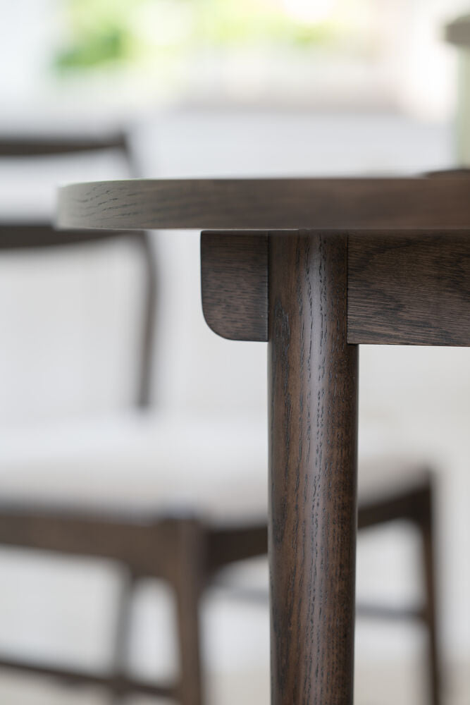 Fairmount är ett elegant matbord i brun ek med en nätt och luftig design. Bordsskivan är i slitstarkt högtryckslaminat, vilket gör den reptålig och motståndskraftig mot väta – perfekt för både livet i vardagen och festliga tillställningar. Den beige kulören på bordsskivan tillsammans med träkantlist i faner och de massiva ekbenen gör att matbordet passar in i de flesta hem.