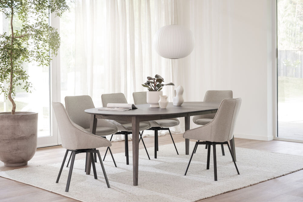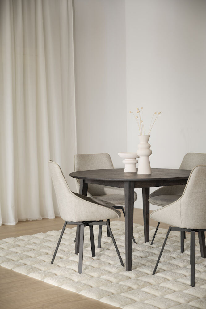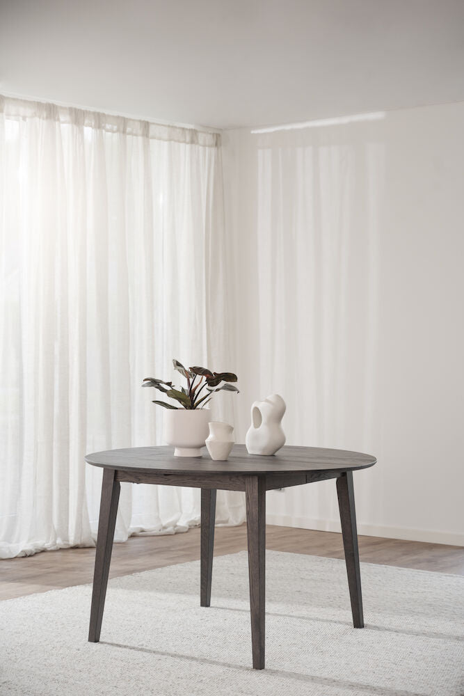 Praktiskt matbord i smidigt runt format med en diameter på 120 cm. Det går att förlänga till 165 cm tack vare en medföljande iläggsskiva, och det går även att köpa till ytterligare ett 45 cm ilägg. Bordets maxlängd blir då 210 cm. Bordet består av massiv fingerskarvad ek som betsats brun och lackats. Matbordet ingår i vår Filippa-serie. Matbordet består av 100% FSC-certifierat trä och är ett bra och hållbart val.