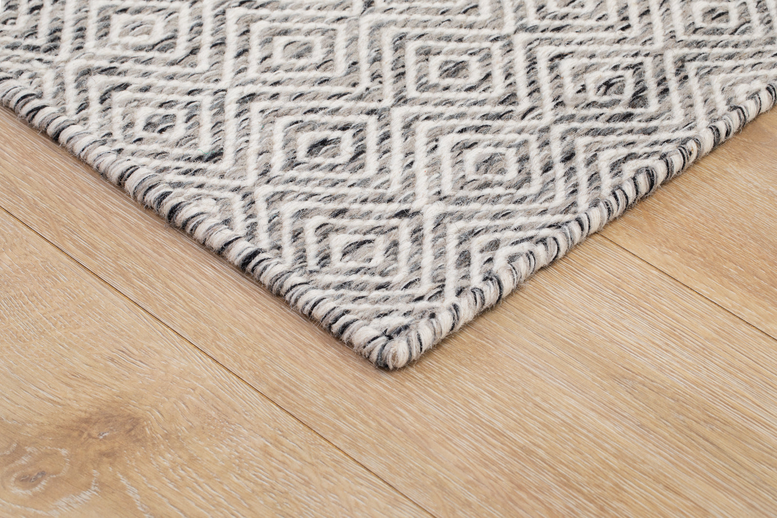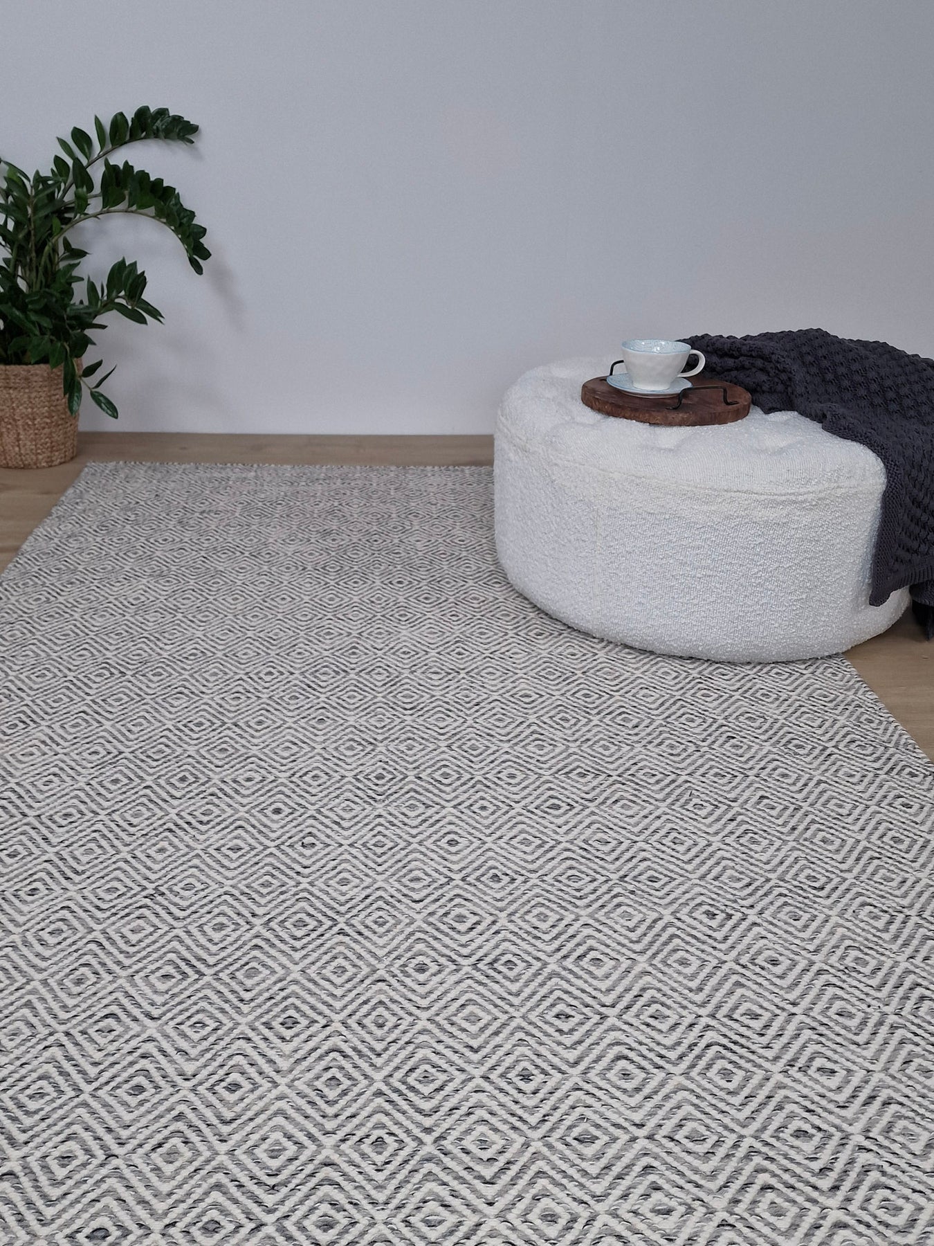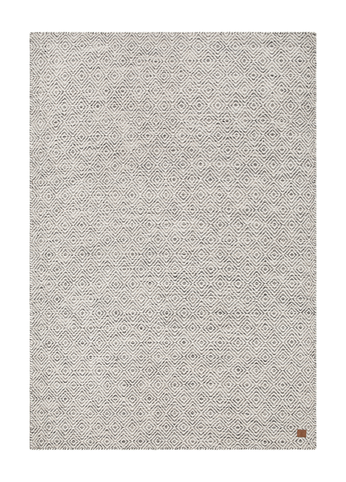 Den Grå mattan har ett ljust grått melerat garn med svarta/vita inslag och ett natur vitt garn som tillsammans utgör dess rutiga gåsöge-mönster. En vacker och tidlös matta som du kan njuta av länge i och med ullens alla fördelar.