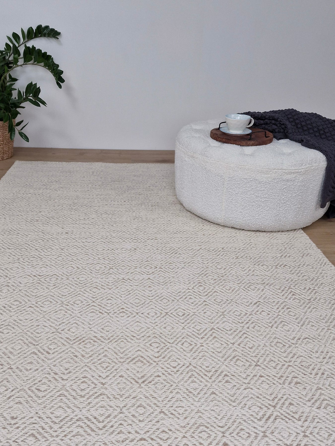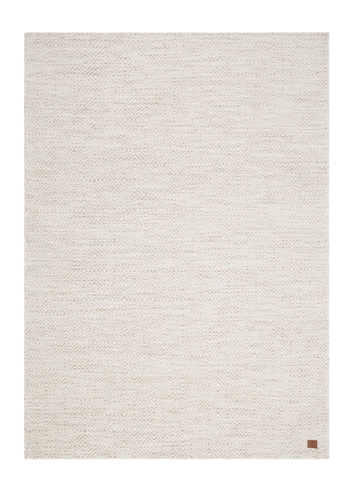 Den Naturfärgade har inslag av ljusa sandiga toner och ett natur vitt garn som tillsammans utgör dess rutiga gåsöge-mönster. En vacker och tidlös matta som du kan njuta av länge i och med ullens alla fördelar.