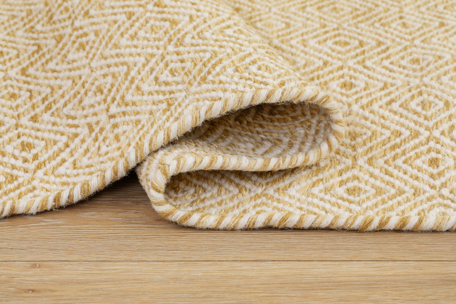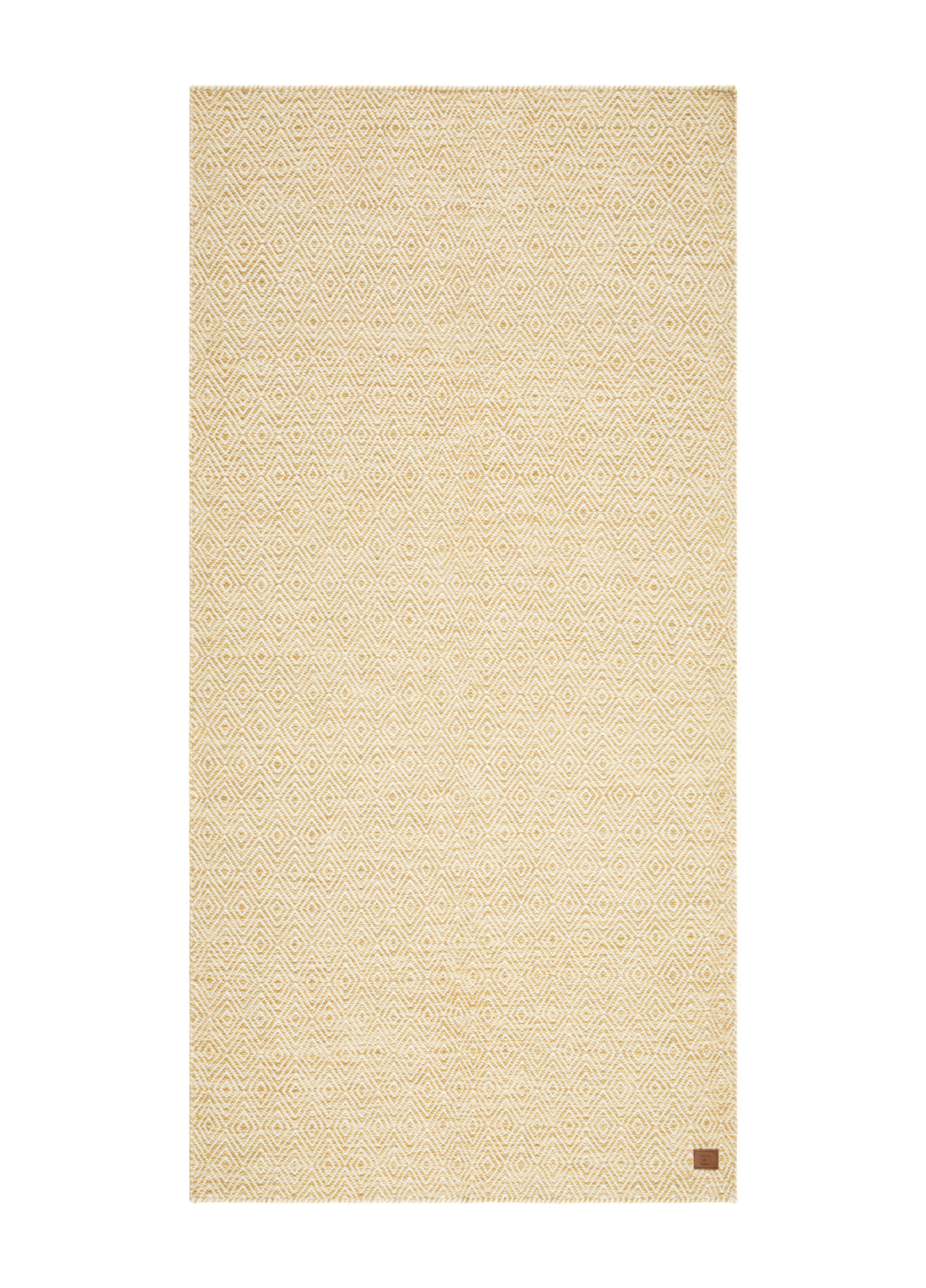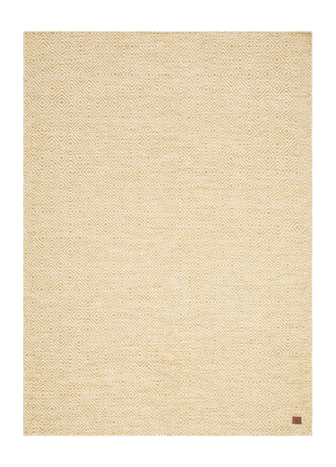 Den Ockragula mattan har ett ljust gulmelerat och ett natur vitt garn som tillsammans utgör dess rutiga gåsöge-mönster. En vacker och tidlös matta som du kan njuta av länge i och med ullens alla fördelar.