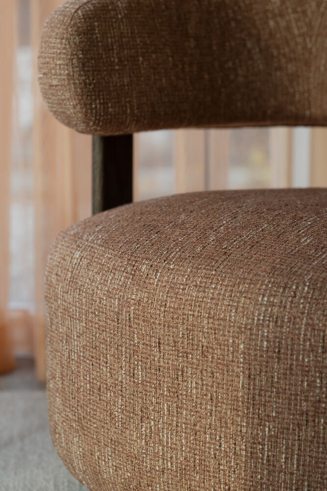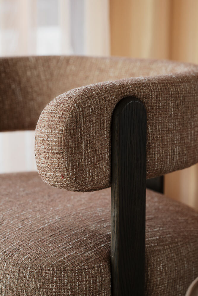 De massiva träbenen i brun ek framhäver det gedigna hantverket bakom möbeln och ger en uttrycksfull kontrast till den mjuka klädseln. Träets naturliga struktur tillför värme och förankrar designen i en tidlös materialitet, samtidigt som benen ger stabilitet och ett visuellt lyft åt fåtöljen. Tillsammans skapar de en balanserad kombination av styrka och elegans.