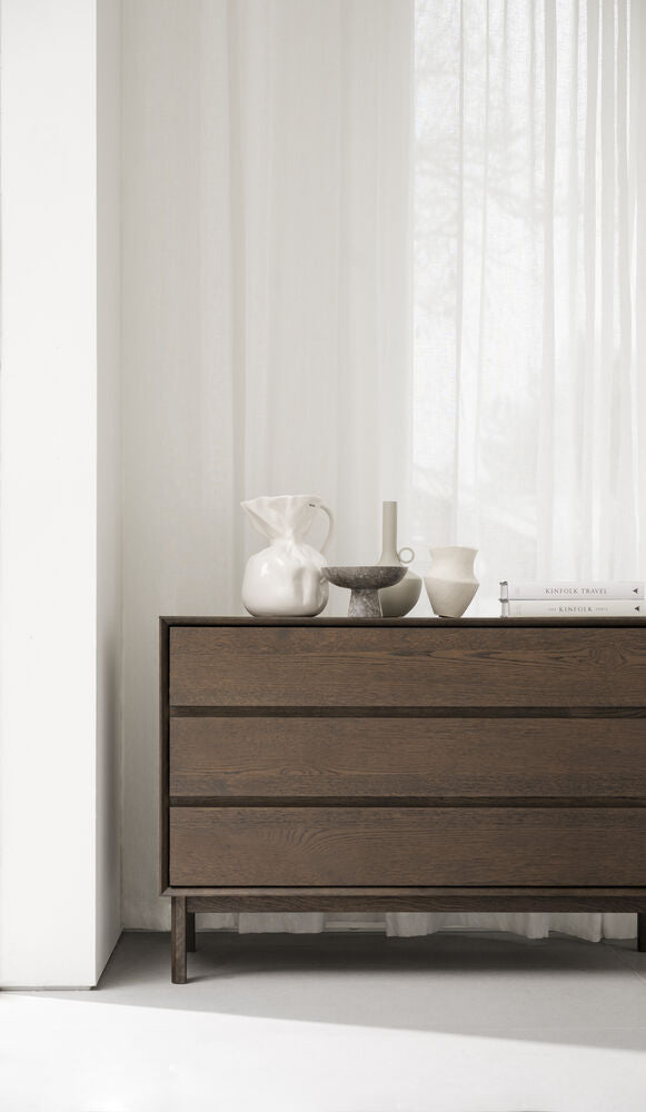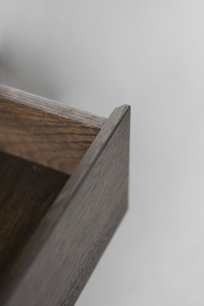 Byrån Mackay i brun vildek med 3 lådor är ett gediget hantverk med girade hörn och en inramning runt lådorna som skapar ett djup och ett härligt skuggspel på möbeln. Byrån är 110 cm bred och har en klassisk design med sina raka linjer, vilket gör den hållbar över tid. Passar lika bra i hallen som i sovrummet. Vildeken som byrån är tillverkad i bidrar till en intressant karaktär i möbelns yta. Mackay finns i tre olika storlekar. Trät i byrån är FSC®-certifierat och finns i alternativen oljad vildek och brunojad vildek.
