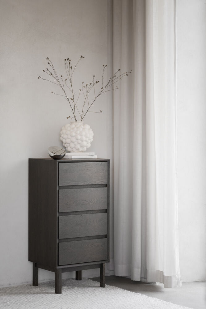 Byrån Mackay i brun vildek med 4 lådor är ett gediget hantverk med girade hörn och en inramning runt lådorna som skapar ett djup och ett härligt skuggspel på möbeln. Byrån har en klassisk design med sina raka linjer, vilket gör den hållbar över tid. Passar lika bra i hallen som i sovrummet. Vildeken som byrån är tillverkad i bidrar till en intressant karaktär i möbelns yta. Mackay finns i tre olika storlekar. Trät i byrån är FSC®-certifierat och finns i alternativen oljad vildek och brunojad vildek.