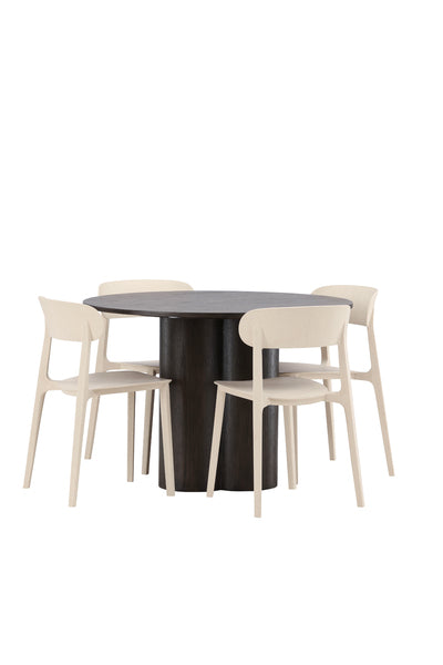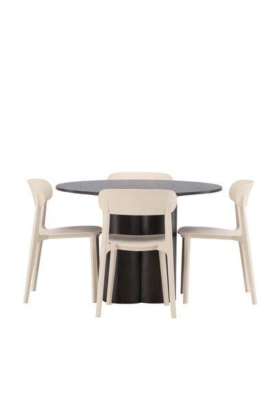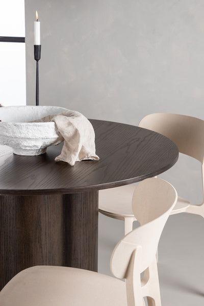 Skapa en social och charmig mittpunkt samla familjen runt i ditt hem! Matbord Olivia imponerar med sin Skandinaviska design och smakfulla utformning. Bordet kommer i en smakfull mocca-kulör i MDF med en tunn, rund toppskiva och tre cylinderformade ben som sitter samlat under bordets mitt. Här tillsammans med stolar från serien Åstol i klassisk design. Stolen är tillverkad i tåligt plastkomposit i smakfull träkulör. De raka nordiska formerna står sig över tid. Här får du en inbjudande matgrupp!