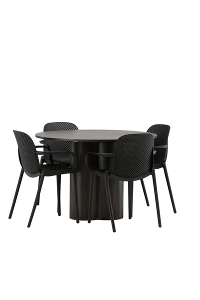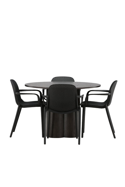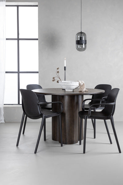 Den perfekta kombinationen av industriell design och moderna former! Matbord Olivia imponerar med sin Skandinaviska design och smakfulla utformning. Bordet kommer i en smakfull mocca-kulör i MDF med en tunn, rund toppskiva och tre cylinderformade ben som sitter samlat under bordets mitt. Här tillsammans med matstolar från serien Baltimore. Stolarna har en industriell design i svart plast vilket gör de lika snygga som slitstarka. Skapa en charmig mittpunkt i ditt hem!