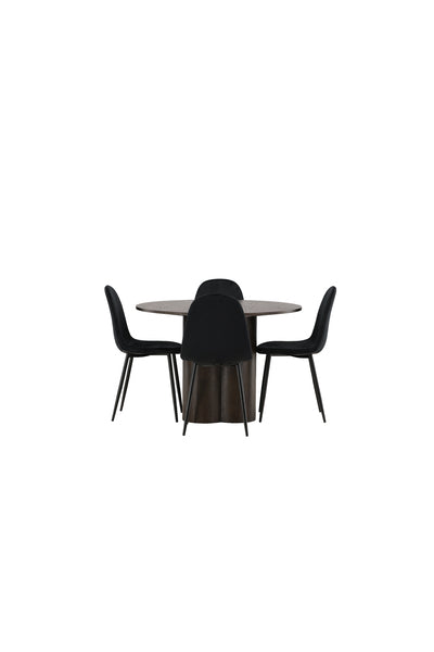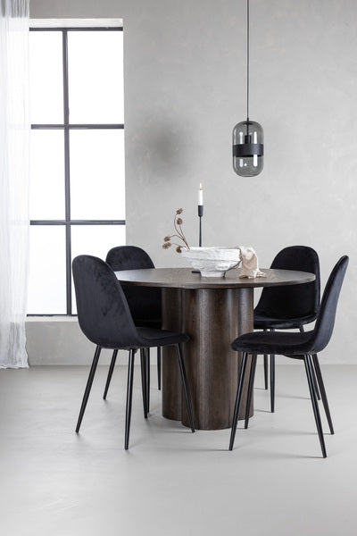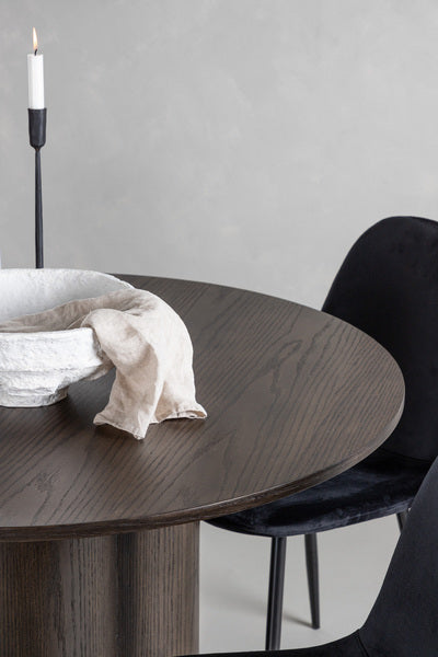Slipp kompromissa mellan stil och komfort! Matbord Olivia imponerar med sin Skandinaviska design och smakfulla utformning. Bordet kommer i en smakfull mocca-kulör i MDF med en tunn, rund toppskiva och tre cylinderformade ben som sitter samlat under bordets mitt. Här i perfekt kombination med stolar från serien Polar. Stolen har en helklädd design med en rundad rygg och sits i svart sammetstyg med mjuk stoppning och ben i svart pulverlackerad metall. Njut av trivsamma måltider!