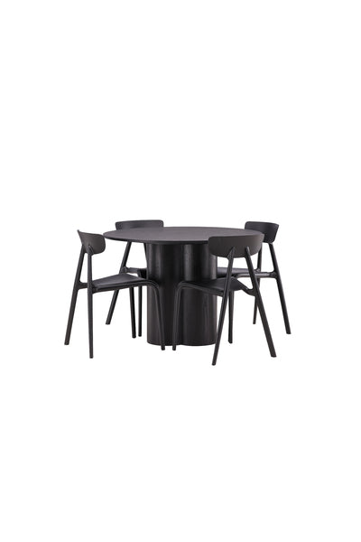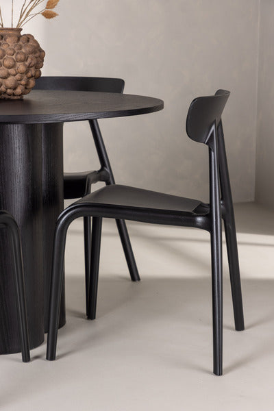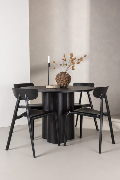 Skapa en trivsam atmosfär i ditt vardagsrum med en modern matgrupp! Matbord Olivia imponerar med sin Skandinaviska design och smakfulla utformning. Bordet har en genomgående helhetsdesign i kaxig svart kulör. Den runda toppskivan är i MDF och stommen utgörs av tre cylinderformade ben som sitter samlat under bordets mitt. Här tillsammans med läckra matstolar från serien Ursholmen. Tillverkade i slitstarkt plast i en smäcker svart kulör som är enkel att matcha med övrig inredning. Stolen har en nätt stolsrygg, något djupare sittplats och lätt utsvängda ben i Skandinavisk design. Slipp kompromissa mellan stil och lämplighet!