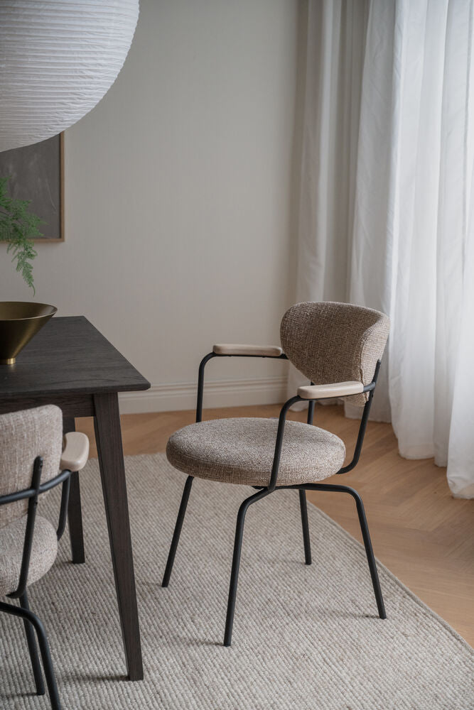 Merrick är en trendig stol med en tunn, elegant konstruktion som kombinerar industriell känsla med varma material. En svart metallram möter sits och rygg i slitstarkt tyg, en harmonisk mix av stram form och inbjudande komfort.