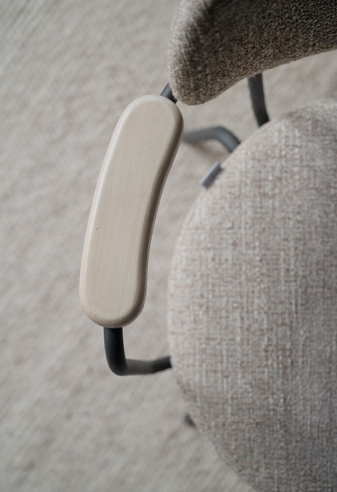 Material: Stålstomme i pulverlack med sandstruktur, sits och rygg i formböjd plywood, sits och rygg klädd med polyeterskum och 100% polyestertyg. Armstöd i massiv ek.