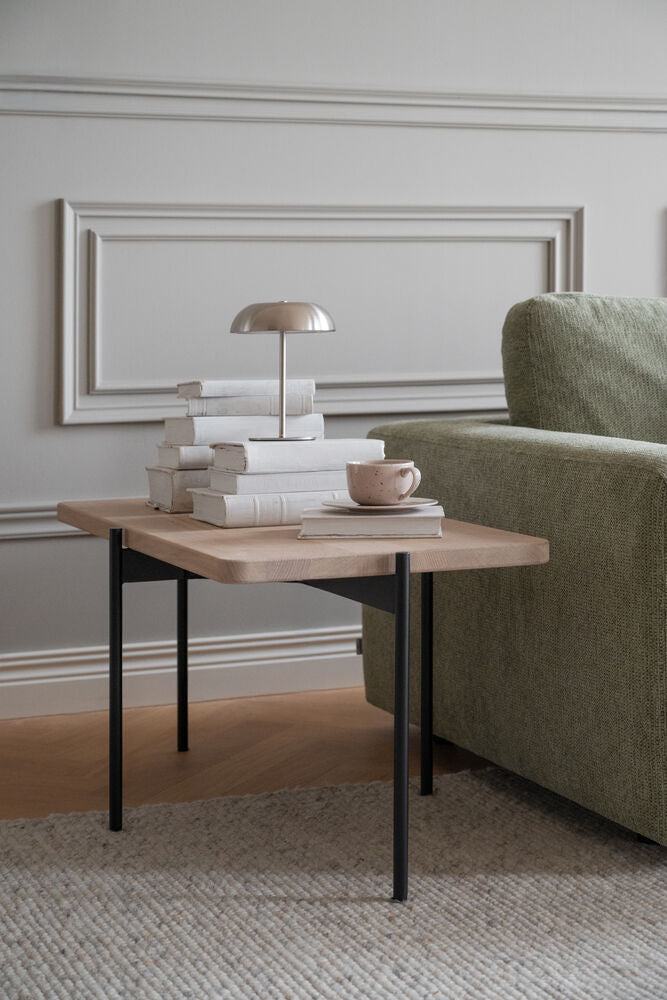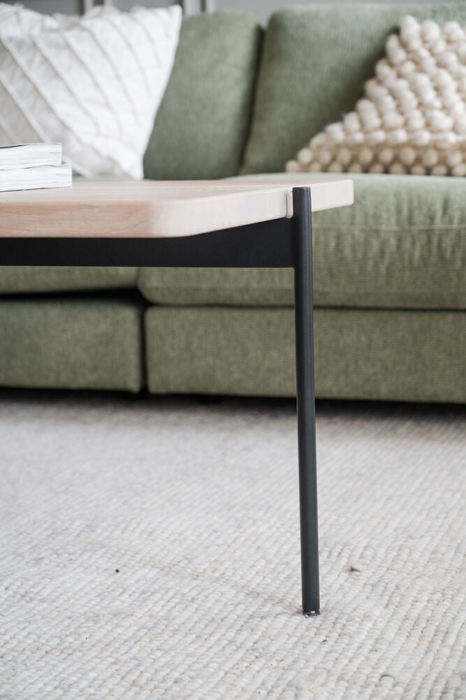 Shelton soffbord 95 cm är ett stilfullt soffbord med bordsskiva i massiv oljad vildek. Svarta metallben i rund profil med justerbara fötter. Shelton är ett modernt rektangulärt soffbord som också finns i brunt samt helsvart utförande. Tillverkat i FSC®-certifierat trä, vilket är ett extra hållbart val.